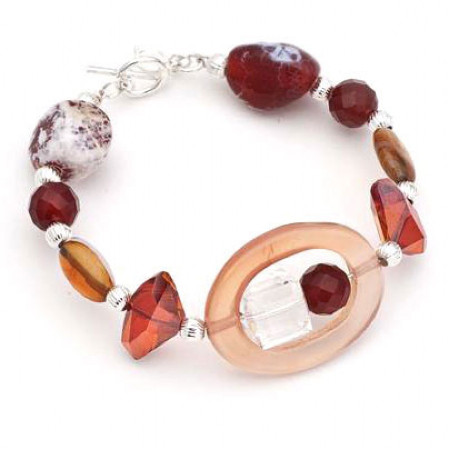Voici un bracelet enfilé argent sterling, cornaline, agate de Madascar, agate de feu, agate rose, Swarovski.