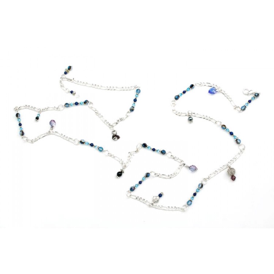Voici une chaine de taille en argent sterling, lapis lazuli, cristal Swarowski bleu