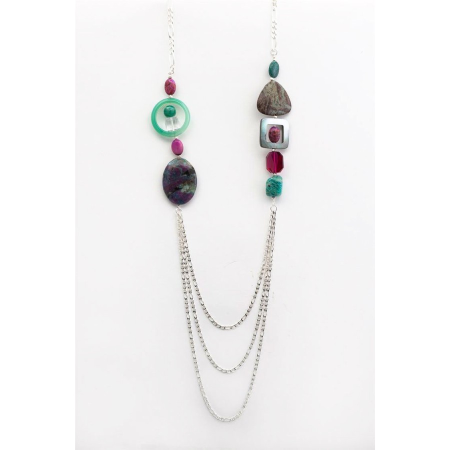 Voici un collier-sautoir argent sterling, amazonite russe, nacre, agate dentelle rose, cuprite, jaspe léopard, apatite brésilienne, agate verte, agate bleue, Swarovski.