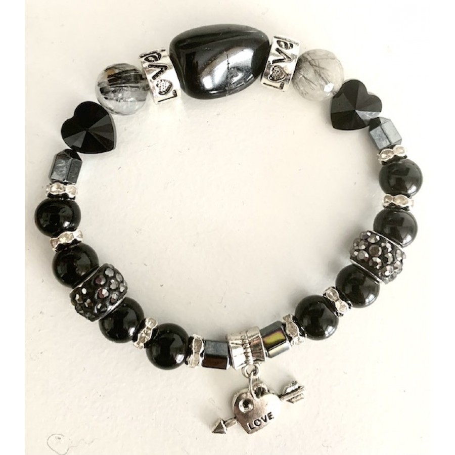 508 Bracelet LOVE sur elastique quartz tourmaline, tourmaline noire, oiel de tigre bleu, hematite
